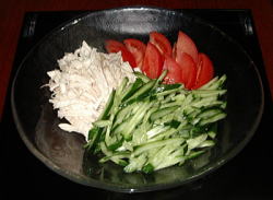 四川料理の前菜と言えば、棒棒鶏(バンバンジー)ですね。ピリッと辛味を効かせるのがコツです。 Jin