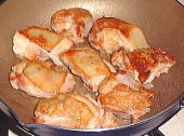 鶏もも肉に両面ともしっかり焦げ目を付けます。次に 白ワインをふりかけアルコールを飛ばします。