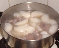 水(スジ肉がたっぷりかぶるくらい)を入れ 牛スジ肉を加え沸騰させます。アクが出てきたら丁寧に取り除き、 酒を加え火を弱め蓋をしゆっくりと煮ます。