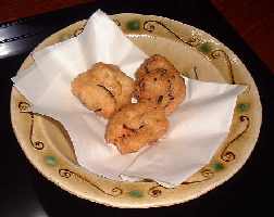 - サラダ油を熱し、2をスプーンなどですくって油の中に落とし揚げます。色よく浮いてくれば出来上がりです。油を切って盛り付けましょう。
