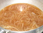- 鍋にバターを引き弱火で気長にじっくりとタマネギを炒めます。途中セロリも加え炒めます。あめ色になるくらいが理想です。