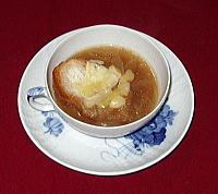 - カップにスープを盛りつけ、フランスパンをスライスして軽く焼いたものをのせ、チーズをのせ、オーブンに入れます。チーズが溶ける程度加熱しましょう。熱いうちに勧めます。