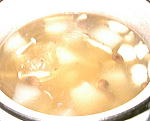 だし汁を煮立て、 冬瓜が柔らかくなるまで弱火で煮ます。冬瓜が軟らかになったら 鶏のもも肉、しめじを加えアクを取ります。