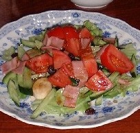 | 赤ワインビネガー¼カップ 酢 ・・大さじ1 しょう油 ・・・¼カップ サラダ油 ・・・¾カップ ごま油 ・・・大さじ2 塩 ・・・小さじ1 ブラックぺッパー 少々 | 全てを混ぜ合わせます。 *Jinの朝食サラダは、バナナ、レタス、きゅうり、ホワイトアスパラ(缶詰)、トマト、レーズン、ベーコン(炒めてカリカリ)が入ります。バランスと早くエネルギーになる物などを考えています。 | マヨネーズ  ・・・大さじ4 プレーンヨーグルト 大さじ1 レモン汁 ・・・少々 パプリカ ・・・少々 | パプリカ以外のものを全て混ぜ合わせます。 ドレッシングをかけた上にパプリカを振ります。 |