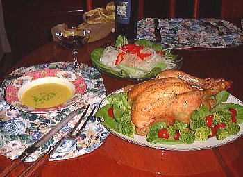 ローストチキン カボチャスープ 赤ピーマンと玉ねぎサラダ 今月はクリスマスに先駆けローストチキンを紹介しました。 調理法はとても簡単です。オーブンに入れる時間はかかりますがテーブルに並べると豪華なイメージがあります。また、カボチャスープは冬至のお料理にも喜ばれる一品です。 |