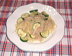 この時期、暑さで食欲減退と言うこともありどうしてもさっぱりしたものばかりに片寄りがちですね。時にはこんなスープ仕立てのパスタはいかがでしょう。ビタミン豊富なズッキーニは、実はカボチャの仲間だったのですね。カロチンも豊富です。Jin