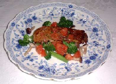 - 盛り付けは、3の野菜を敷き、2の魚のムニエルをのせます。最後に1のソースをかけ出来上がりです。