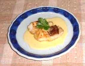- 皿に4の鯛のムニエルを付け、回りからソースをかけ盛りつけます。