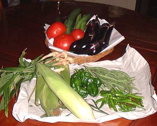 そして、生姜の下がトウモロコシ、右にピーマン、いんげん、青唐辛子です。