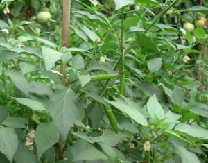 唐辛子の花は白いのですよ。その奥にトマトが見えますか?