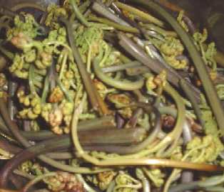 旬は3月〜5月頃。アクが強いので、アク抜きしてから使います。蕨にはビタミンB1を分解してしまう酵素が含くまれています。灰または重曹をかけて熱湯を注ぎ、そのまま冷やし水洗いすれば、とビタミンB1が失われる事無く摂取できます。 調理法は、そのままお浸しでも、炊き込みご飯にも、そばの付け合せとしても、工夫次第です。 |