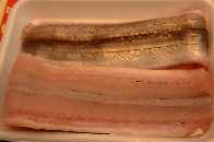 | スズキは、夏場の高級魚。年齢と共に、コッパ、セイゴ、フッコ、スズキと、名が変わる出世魚です。それと共に脂ののりも多くなるそうです。 お刺身、塩焼き。 |